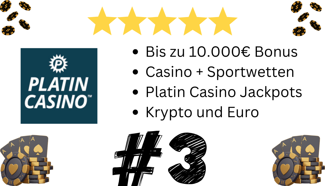 Im Platin Casino erwarten Sie erstklassige Spiele, lukrative Boni und ein reibungsloses Spielerlebnis, das Maßstäbe setzt. Bereits seit 2013 bietet es eine riesige Auswahl an Slots, Tischspielen und Live-Casino-Angeboten an. Kombiniert mit sicheren Zahlungsmethoden und schnellen Auszahlungen.