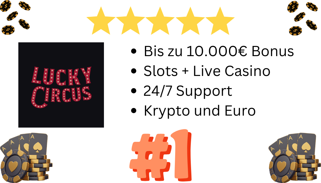 Bei Lucky Circus erwartet Sie eine riesige Auswahl an Spielen, großzügige Willkommensboni und ein unvergleichliches Casino-Erlebnis – bequem auf allen Geräten. Genießen Sie sichere Transaktionen, blitzschnelle Auszahlungen und ein aufregendes Angebot von klassischen Slots bis hin zu Live-Casino-Spielen.